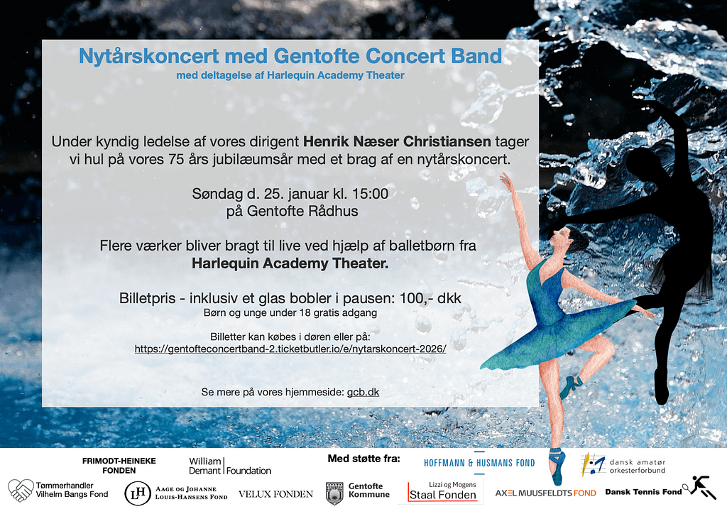 Glæd dig til orkestrets festlige nytårskoncert på Gentofte Rådhus. Koncerten bliver ud over det sædvanlige, da 15 ballerinaer i alderen 8 – 15 år fra Akademiet Harlekin vil danse til nogle af orkestrets numre. Med andre ord får du både ballet og musik i samme koncert. Nytårskoncerten er samtidig starten på fejringen af orkestrets 75 års jubilæum, hvor vi samarbejder med børn, unge og voksne i Gentofte kommune, der enten spiller musik eller engageret i andre kulturgenrer.